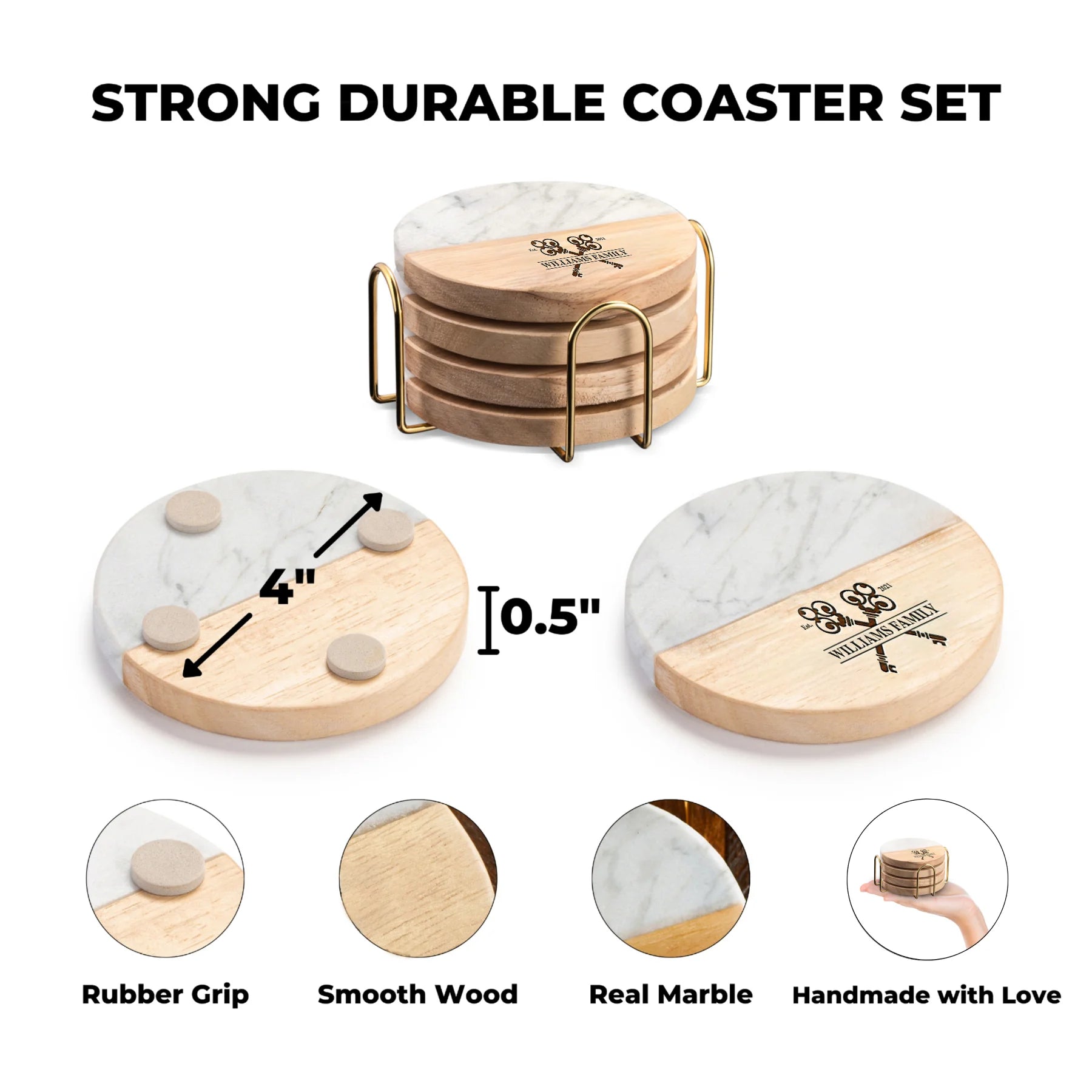 • Great for Entertaining With its striking blend of marble and wood, this personalized coaster set adds a touch of refined elegance to any gathering, making it the perfect complement to sophisticated entertaining.