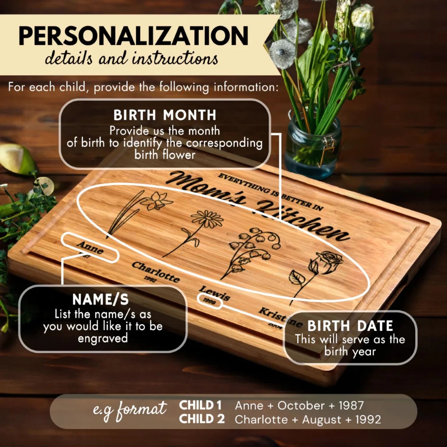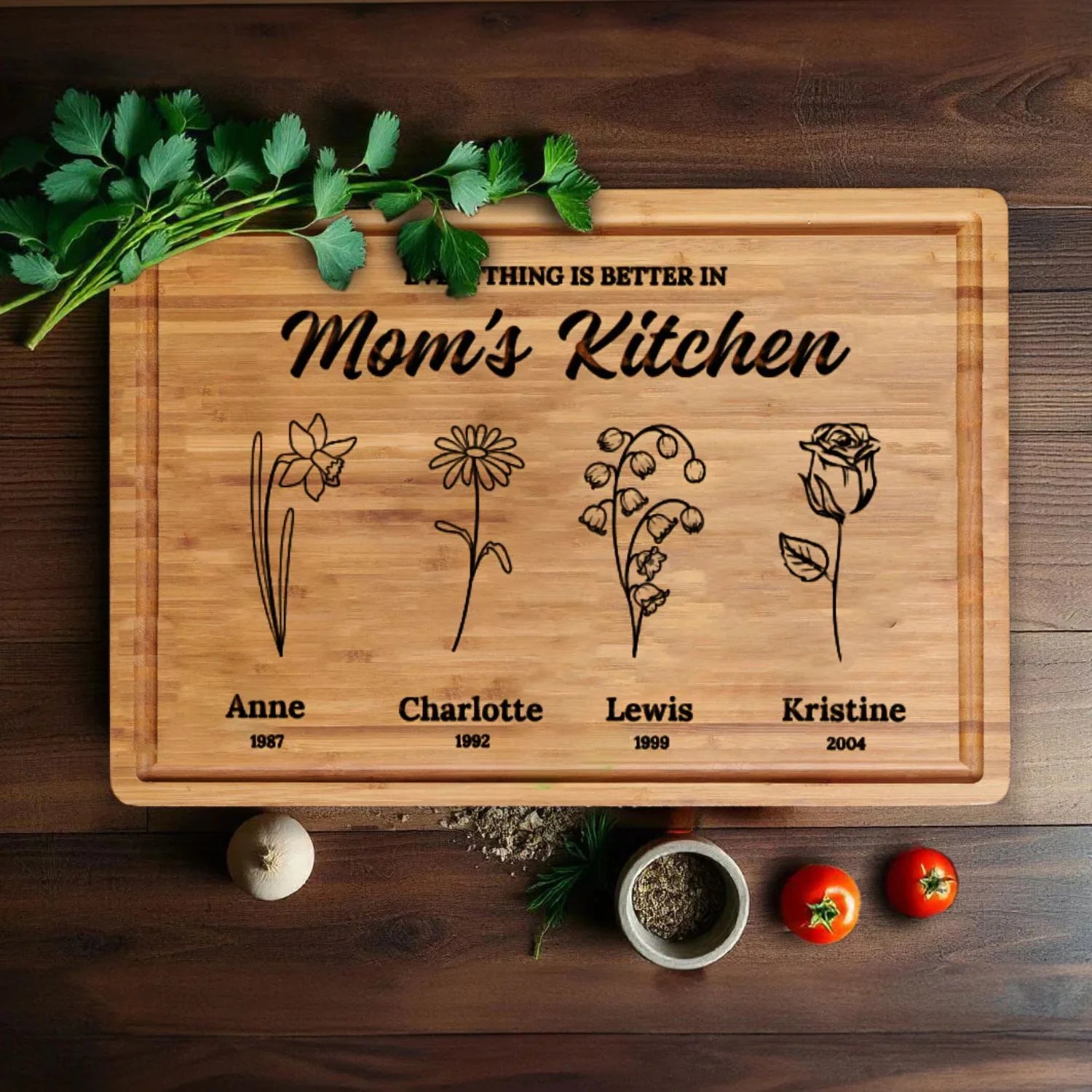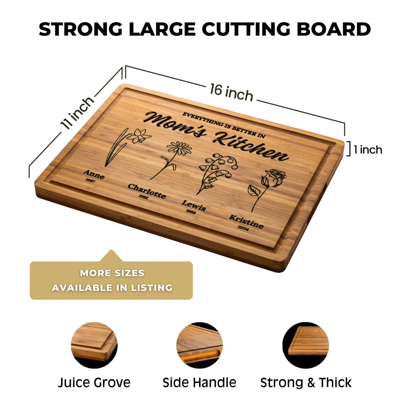 Celebrate the heart of your family with our Personalized Mother’s Day Cutting Board, featuring a beautiful Birth Flower Chart of her children. A sentimental piece that honors the unique bond between a mother and her children, creating a heartfelt gift that will bring joy and meaning to her everyday moments.