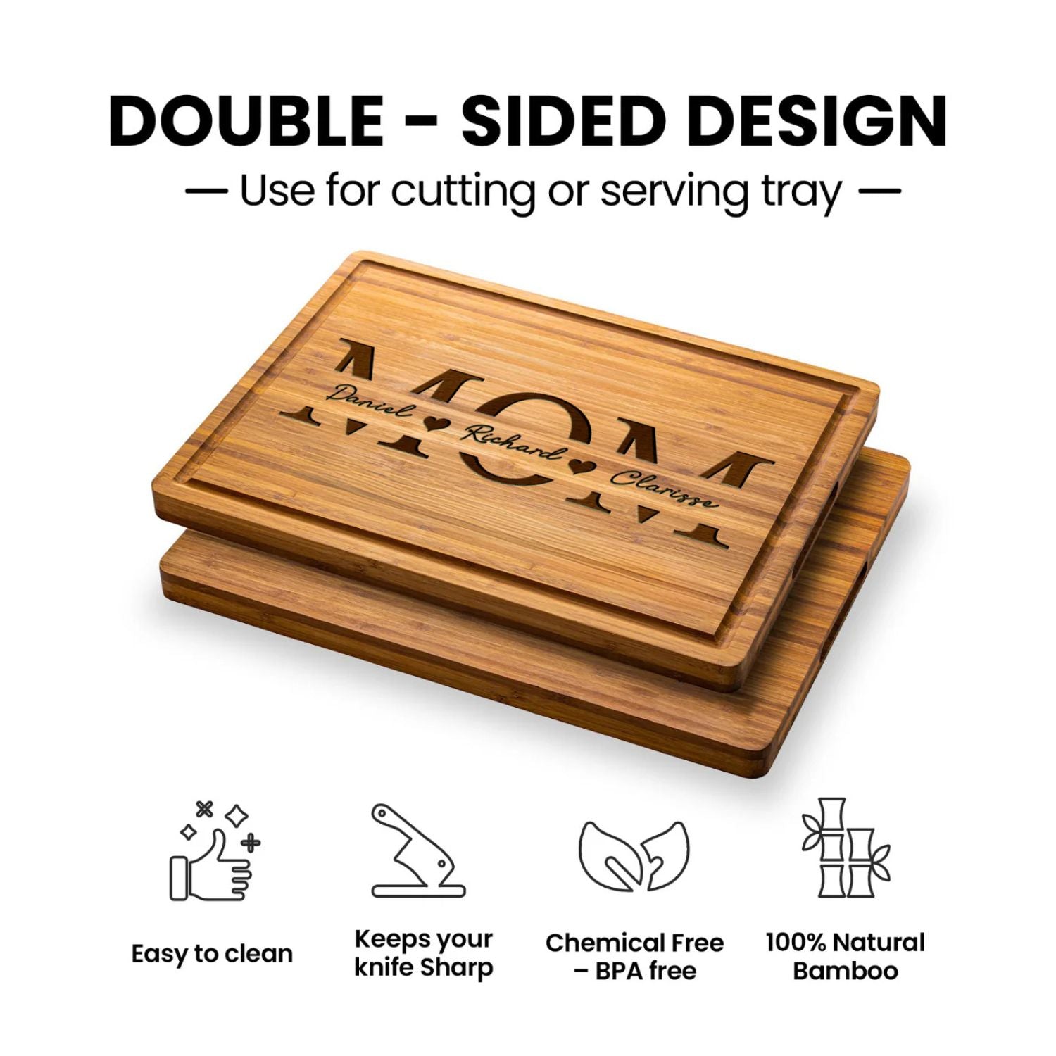 This personalized cutting board is the perfect gift for Mom, beautifully engraved with her children's names to remind her of the love that fills her kitchen. Crafted from high-quality wood, it’s both a functional kitchen tool and a heartfelt keepsake she’ll cherish forever.
