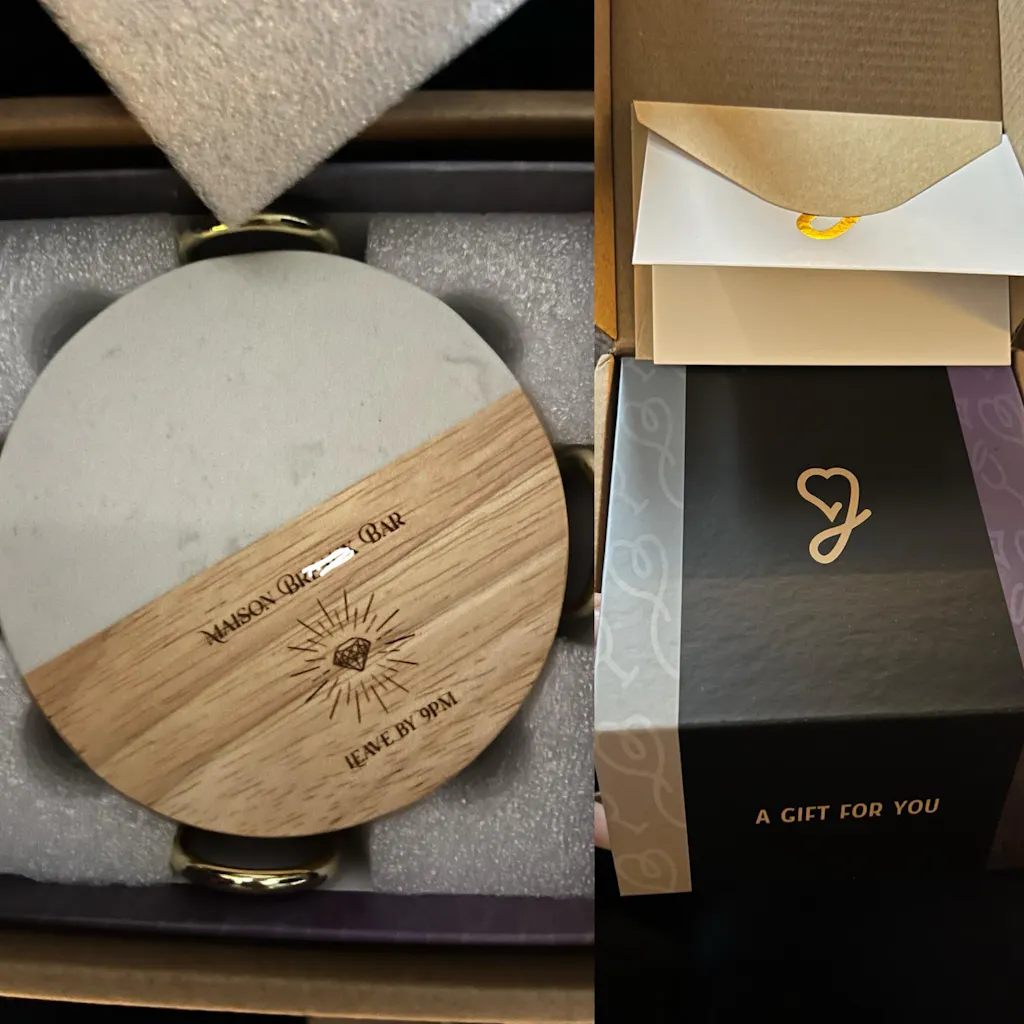 With its striking blend of marble and wood, this personalized coaster set adds a touch of refined elegance to any gathering, making it the perfect complement to sophisticated entertaining.