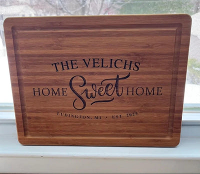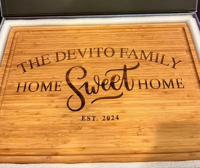 "I love how this cutting board turned out for our friend’s new home. It’s gorgeous! I ordered it Thursday and it was delivered Monday, one day earlier than expected!! Very fast delivery! Jennifer worked closely with me to get the design just the way I wanted it. She responded very quickly to my questions and put together a few mock up’s until it was just perfect. Thank you so much, Jennifer! Excellent seller!"